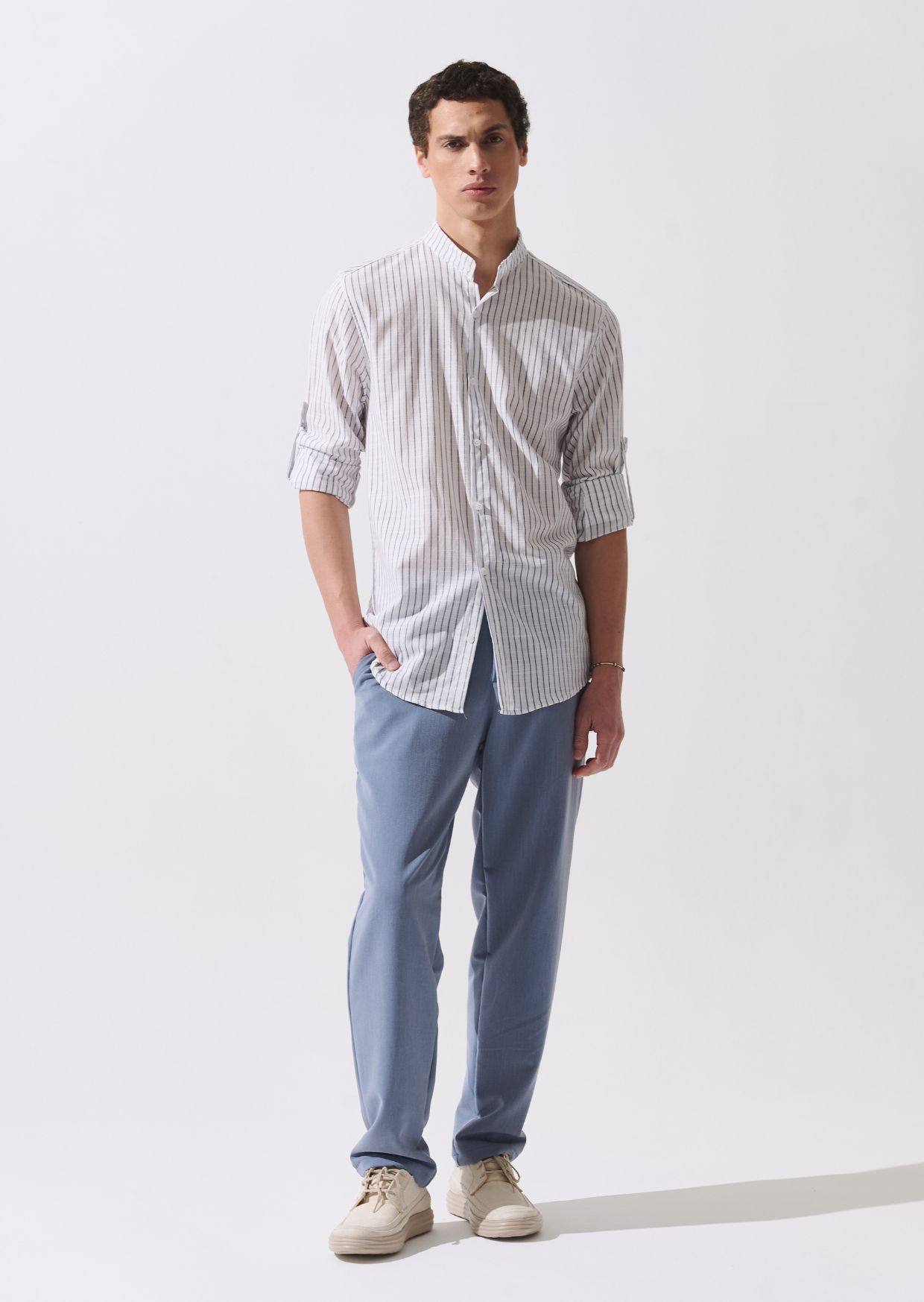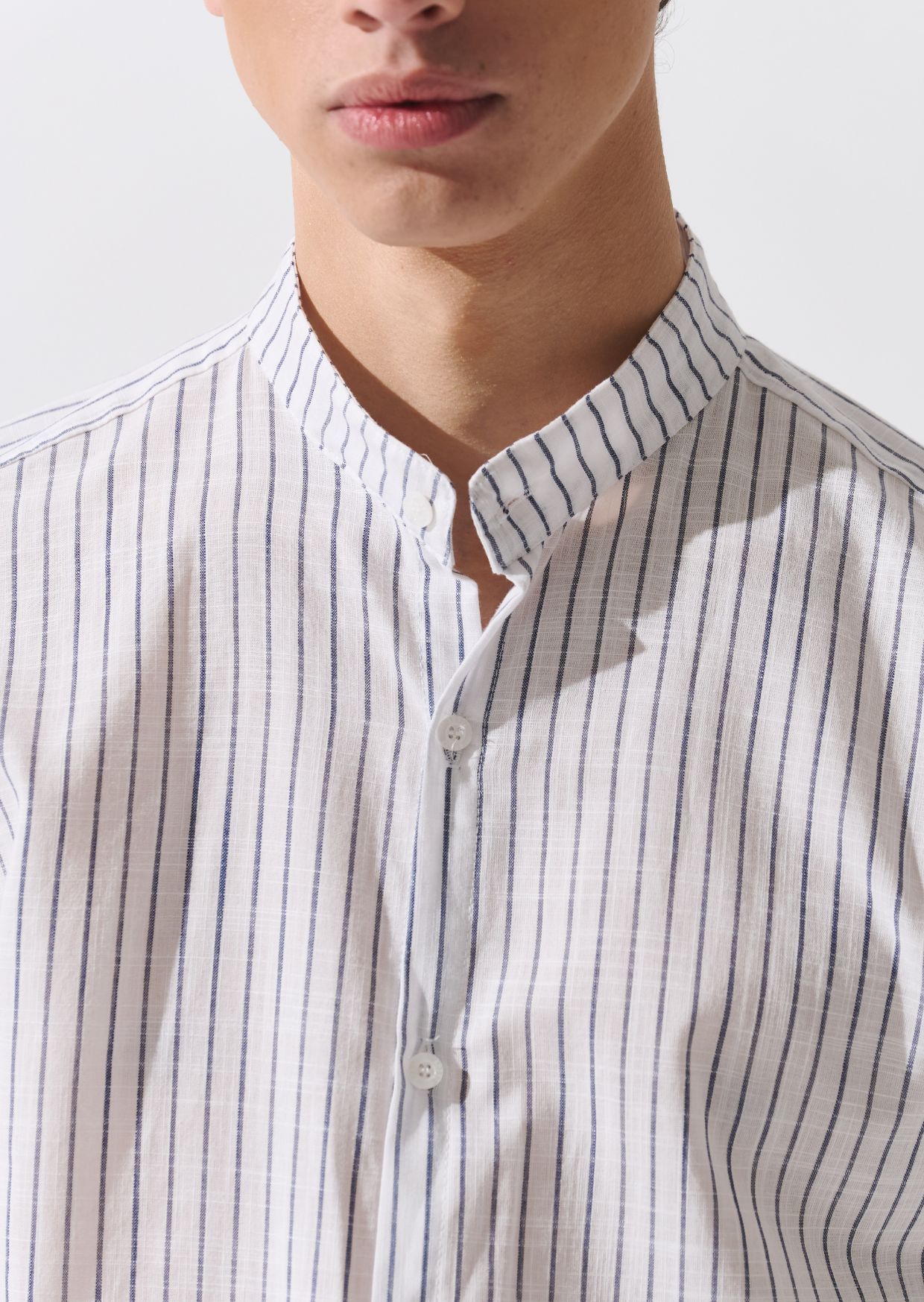 Nuestra camisa Cuba es un modelo holgado y recto, de cuello mao. Realizada en lino, con un diseño de finas líneas verticales. Tiene un estilo fresco, ideal para el verano. Cuenta con enganche para arremangado. Disponible en cuatro colores.