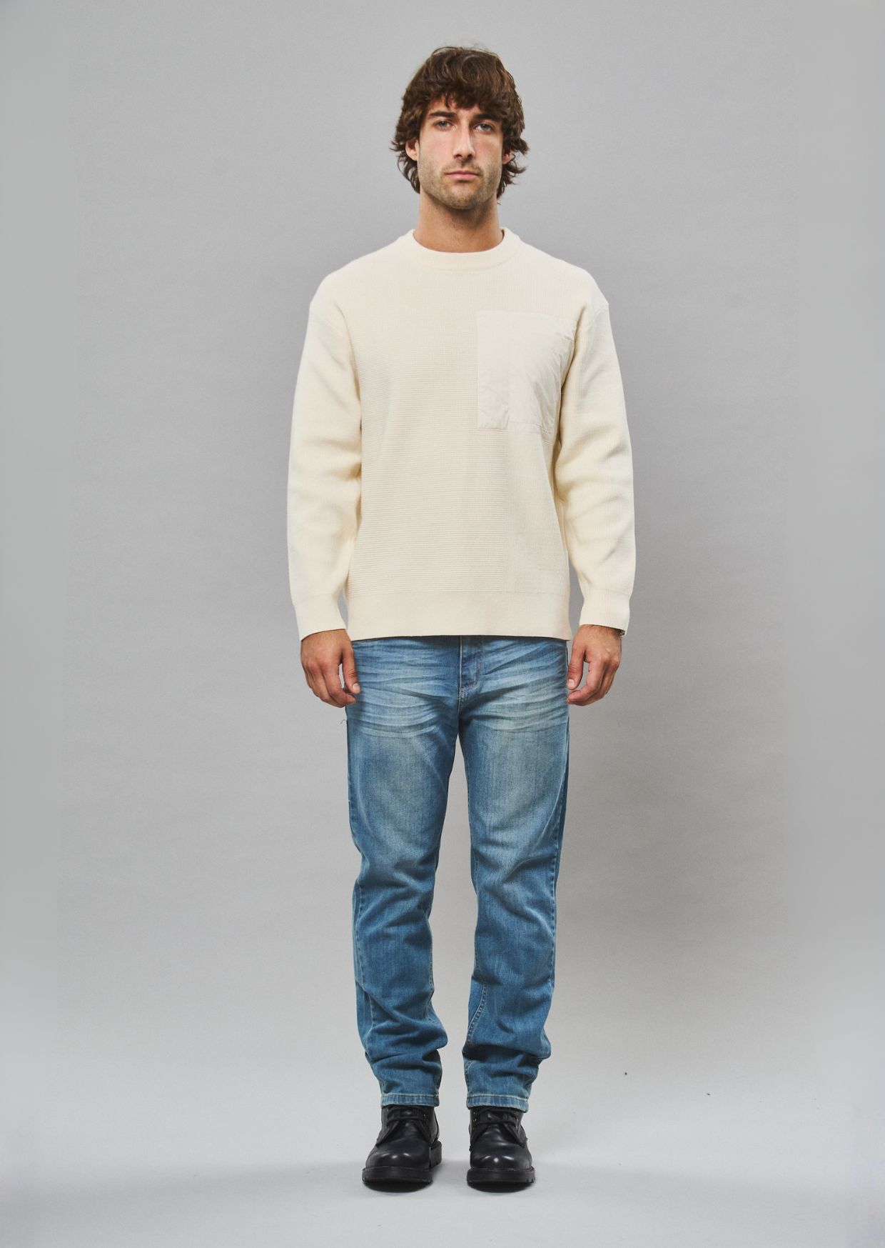 El Sweater Charles es un modelo de corte regular, con cuello redondo. Es una prenda abrigada, con una textura suave al tacto. Con puños y cintura elastizados. Posee también un detalle de bolsillo en el pecho, en otra tela; para darle un toque distinto y original. Viene en color crema, negro y verde.