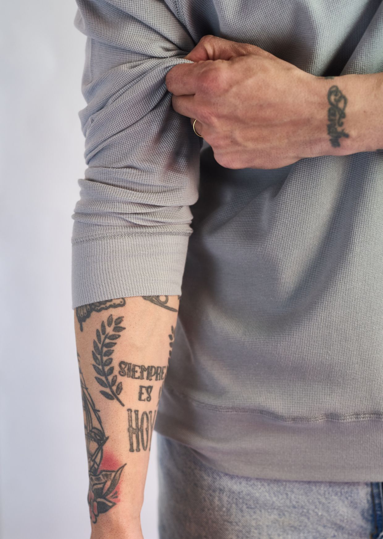 Nuestro Sweater Pitt es un modelo realizado en micro panal, de algodón. Es un modelo de corte regular, no muy suelto, que lo hace idea para utilizar debajo de una chaqueta o abrigo. Disponible en color gris y beige.