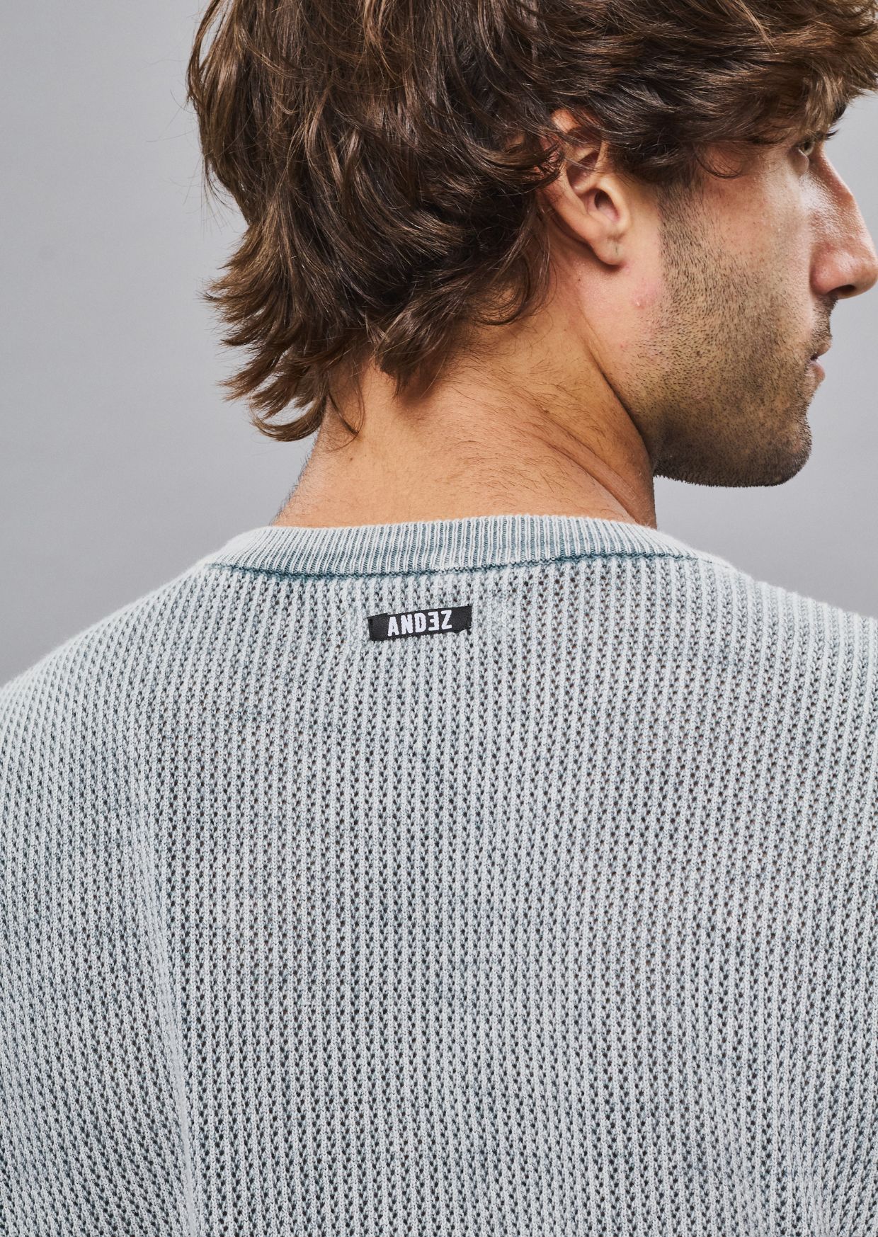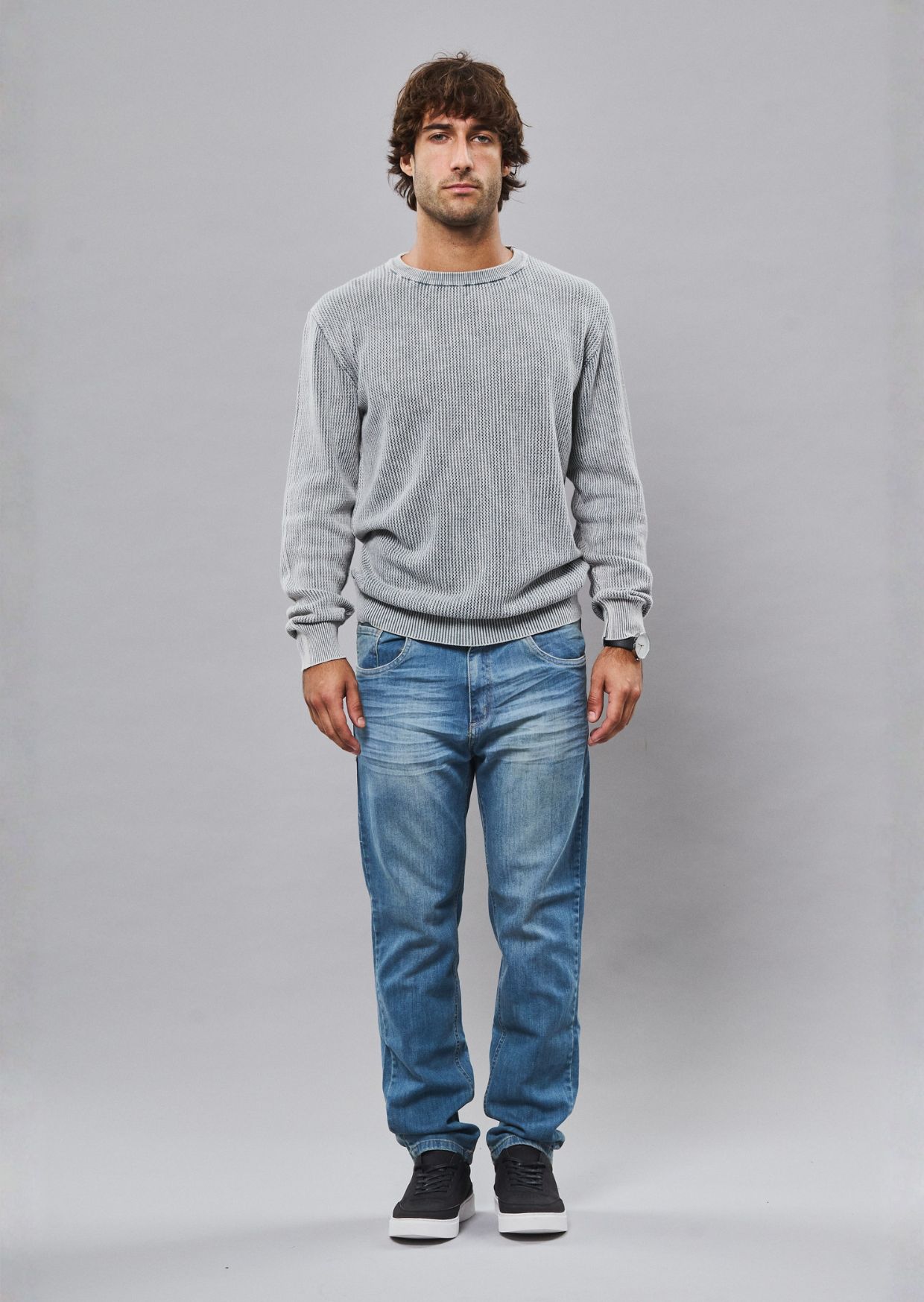 El Sweater Russel es un modelo de corte regular, con cuello redondo. Es tejido, no muy pesado, ideal para media estación. Posee efecto lavado, que le otorga un aire desgastado y grung; con puños y cintura elastizados.